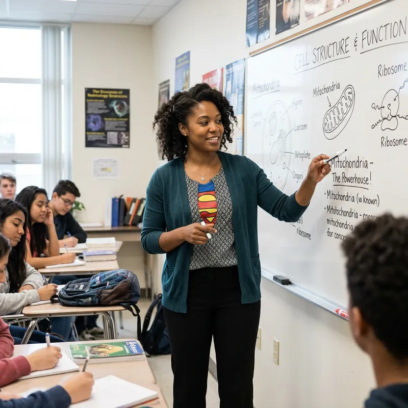 Create me an image of a female teacher with curly hair standing next to board teaching and slightly underneath the clothes is the sign of a superhero logo.