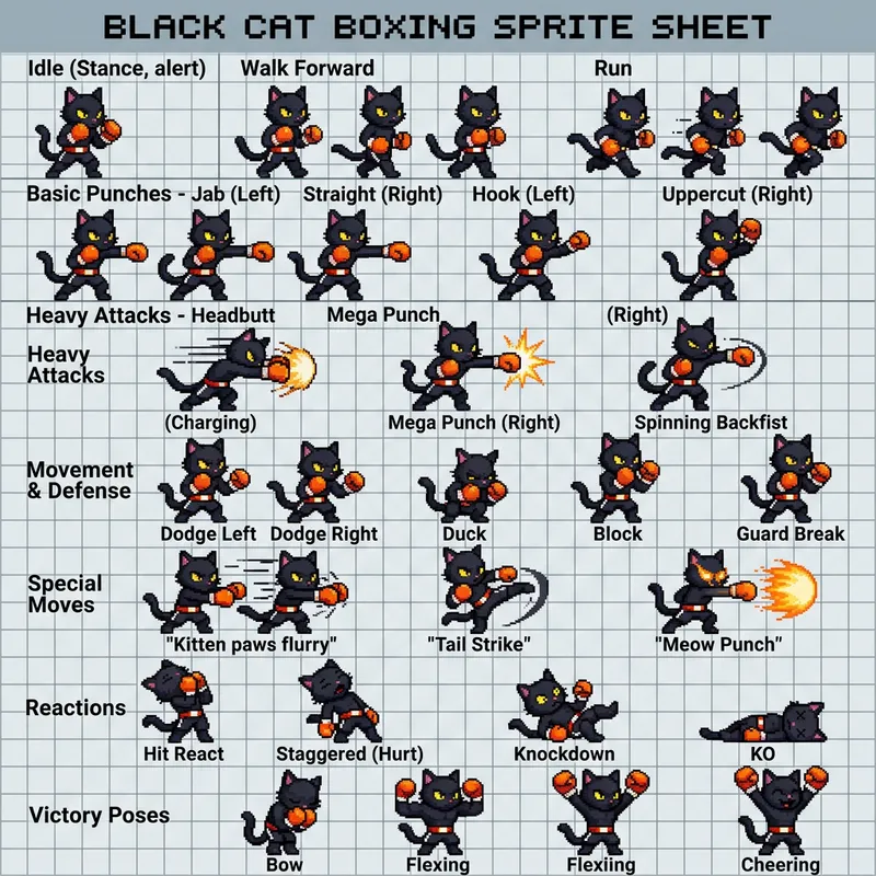 create multiple sprites for a 2d arcade fighter black cat boxing.