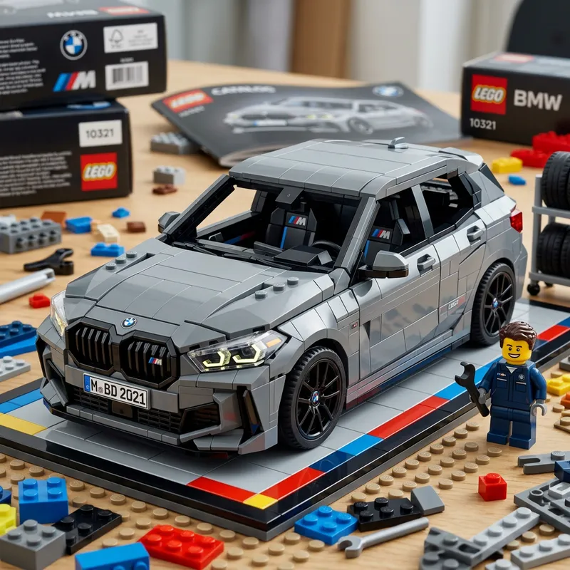 Creation of a LEGO version of a car; the model to be transformed is a 2021 BMW 1 Series M Sport in medium gray. Constructed from LEGO bricks with colorful, interlocking blocks, it boasts a realistic aesthetic that respects both the original model and the style of official LEGO minifigures.