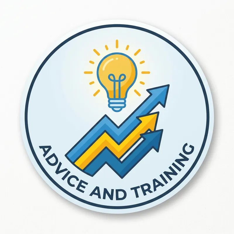 An icon symbolizing advice and training. The design includes a simple illustration of a lightbulb representing ideas and knowledge, with a series of arrows pointing upwards to denote progress and learning. The color scheme is a mixture of cool blues and warm yellows, reflecting a balance between logical thinking and creativity. The icon is set on a round badge with a thin border, and a robust and readable text at the bottom that says 'Advice and Training'.