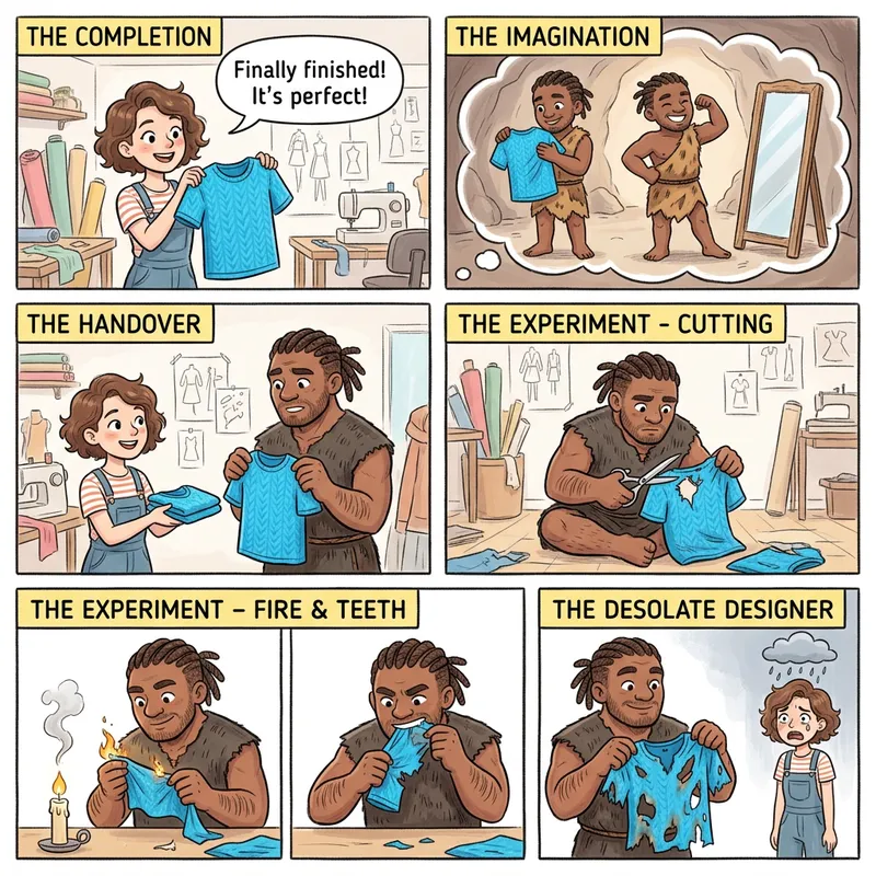 Draw a cute cartoon where initially, a Caucasian female fashion designer completes a short-sleeve clothing article. Then, imagine her giving this clothing to a prehistoric man. In the imagination, the prehistoric man who is of African descent, explores the softness of the outfit and tries on a few poses in front of a mirror. Now, the designer actually gives the outfit to the prehistoric man, who gazes at it with a puzzled expression. He later destroys a portion of the outfit using scissors, sets part of it on fire, and tears some of it with his teeth. All the while, the stunned designer, standing in the background, watches this spectacle with a shocked and desolate expression.