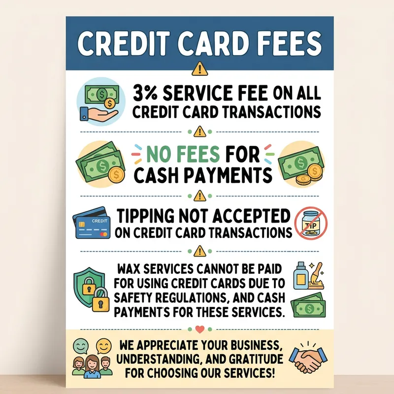 An informational poster designed to state the credit card fees. Bold title at the top saying 'CREDIT CARD FEES'. There is a warning statement in the middle '3% Service Fee on All Credit Card Transactions', encouraging cash payments. Highlighted in a pleasant manner 'NO FEES FOR CASH PAYMENTS'. A few inches below, another caution note stating 'Tipping Not Accepted on Credit Card Transactions'. In the lower part of the poster, there's informative text mentioning that wax services cannot be paid for using credit cards due to safety regulations, and cash payment is required for these services. At the bottom, a kind note expressing appreciation, understanding, and gratitude towards the customers for choosing the services.