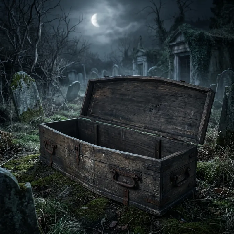 Creepy Old Coffin in Mysterious Moonlit Graveyard