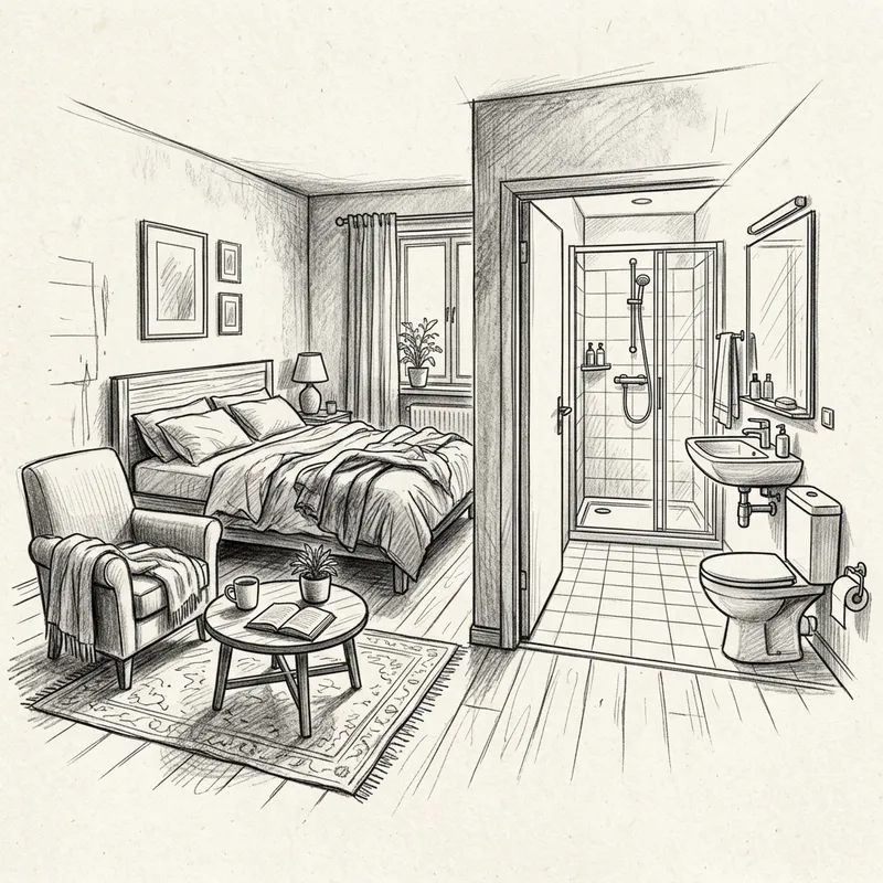 Create a sketch: Bedroom space (Double bed), Armchair, Coffee table, Bathroom (Shower, sink, toilet).