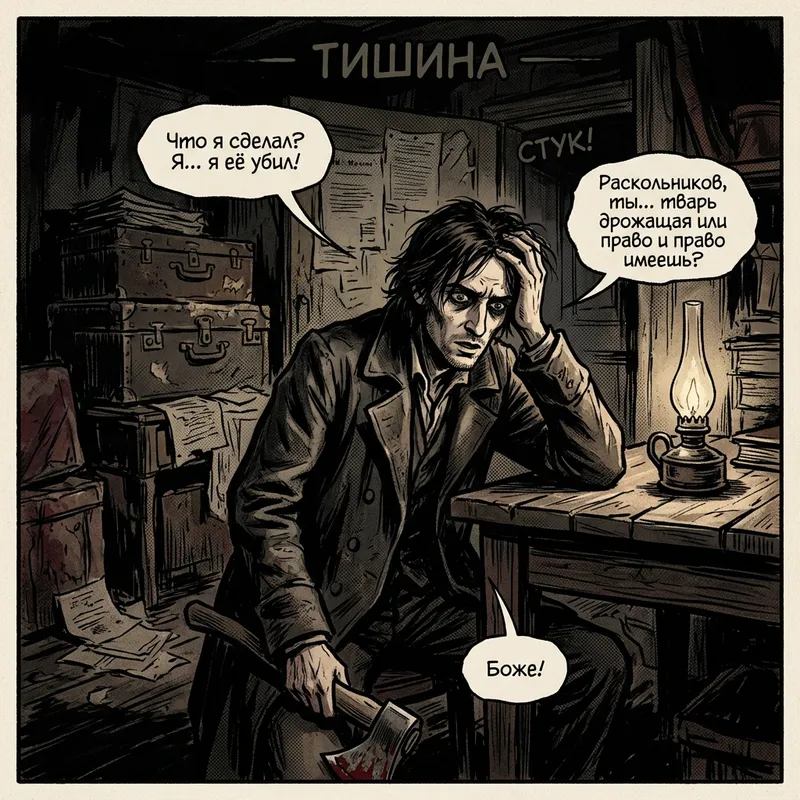 An artwork capturing a scene from the novel 'Crime and Punishment'. Designed in the style of a graphic novel, embodying dark tones and deep contrasts. The focus is on Raskolnikov during the peak moment of his crime. The composition is dense and uses Russian text in speech bubbles. The whole image carries a somber, heavy atmosphere reflective of the cultural and emotional context of the story.