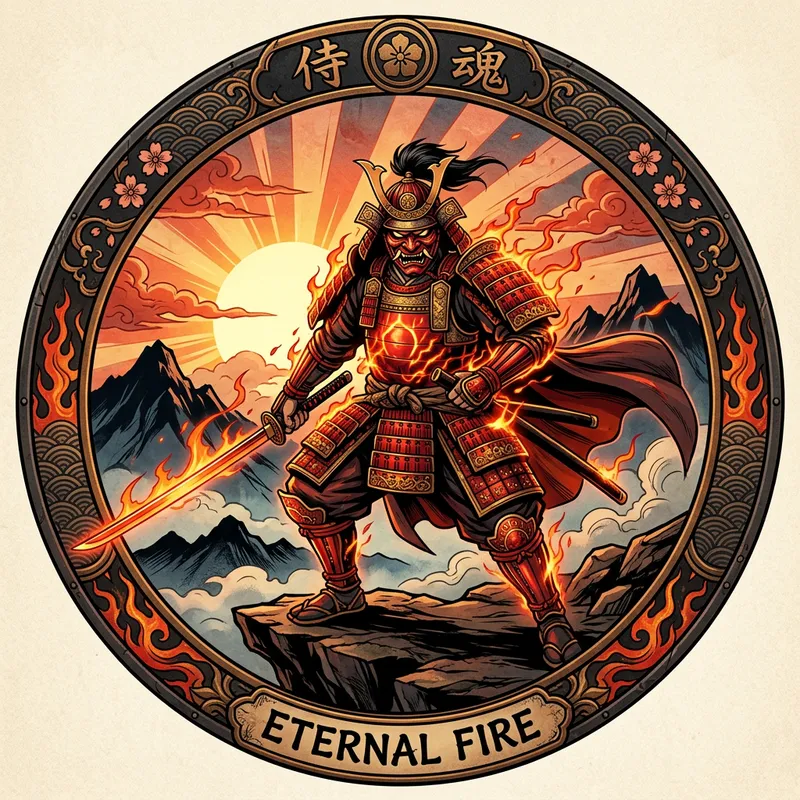 Imagine an ornately-detailed scene of a samurai, who has distinct features of East Asian descent and presents as male. He is adorned in glowing crimson armor, the reflections of which appear as ripples of liquid fire. Embedding a chilling ambiance, he wears a traditional demon mask, eerily similar to a Kabuki theater prop. Behind him, the sun rises symbolizing the dawn of a new day. The entire scene is enclosed within a circular frame, and its artistry reminiscent of age-old Japanese anime style – dynamic, dramatic, and intense. It gives the impression of an action-packed logo or emblem symbolic of martial bravery and ancient mythology.
