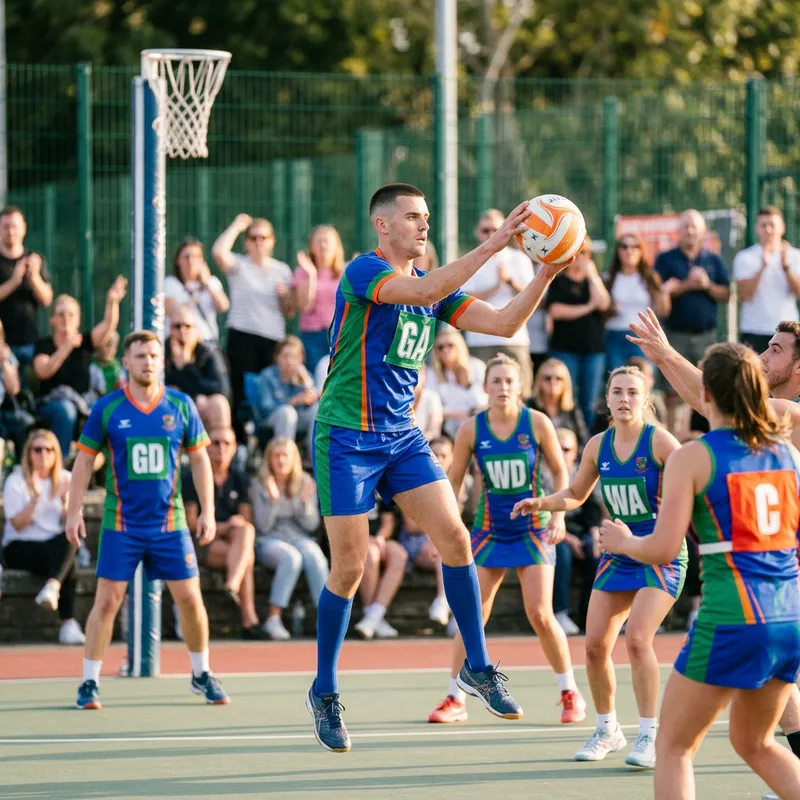 A professional soccer player with short hair, athletic build, and notable agility, similar in physique and abilities to popular soccer professionals, is seen playing netball. He maneuvers swiftly, precisely throwing and catching the ball. The pitch is brimming with energy, and the spectators are keenly observing the game. The player, seen in a vibrant sports outfit, is wholly engrossed in the sport, with a focus dedicated to skillfully passing the ball and aiming for goals.