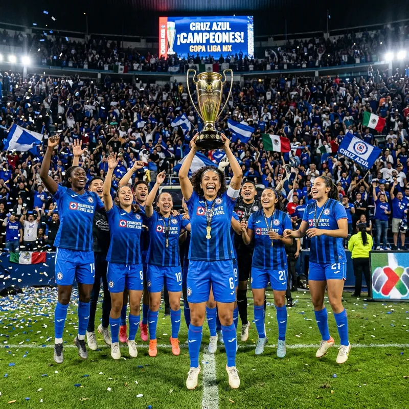 A photo of the soccer team Cruz Azul winning the cup. The players, diverse in complexion and ethnicity, are jumping up in triumph, their faces alight with joy and relief. The stadium bursts with energy and bright lights, with thousands of fans on their feet, clapping and cheering. The verdant green pitch under their feet contrasts with the predominantly blue uniforms of the team. The golden cup is held aloft by the captain, a Latina woman, sparkling under the floodlights.