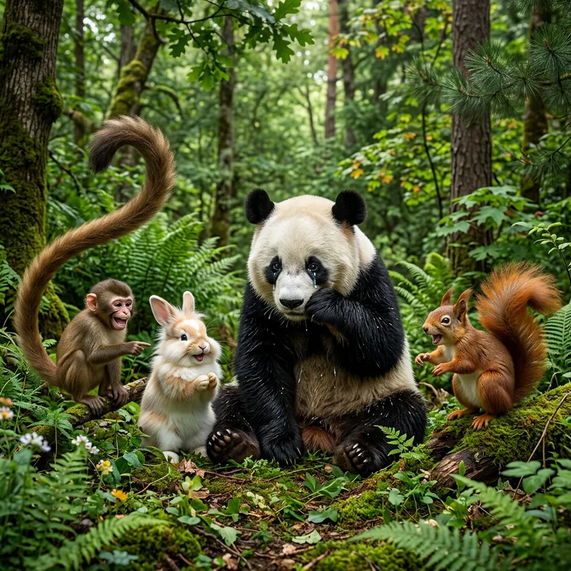 A distraught panda sits in the middle of a lush green forest. Other animals, a grinning monkey with an elongated tail, a cheerful rabbit with fluffy fur, and a jovial squirrel with a bushy tail, are surrounding him. The animals seem to be jesting and making light-hearted fun, but the panda, with teardrops streaming down his black and white furry face, exhibits his displeasure openly.