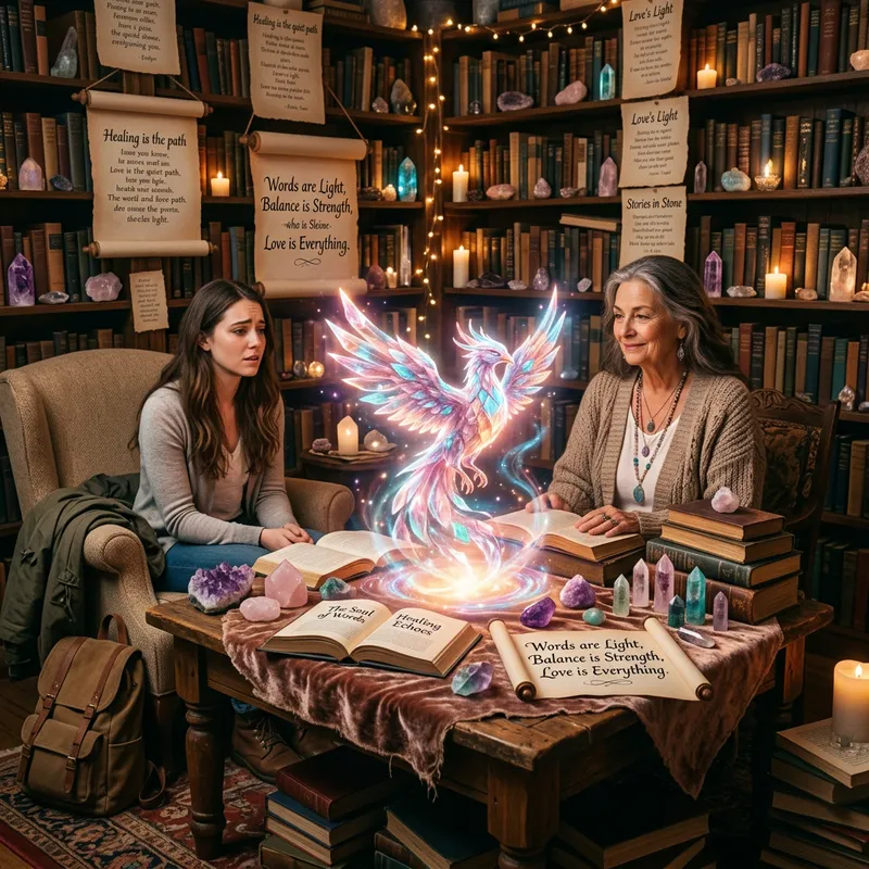Create an image of the birth of a spirit animal - a mascot representing love, elemental balance, and the soul of language. Imagine the mascot as a crystalline entity, full of positive energy and wisdom. Let's place this in an ambiance that showcases the owner's passion for assisting people through selecting suitable crystals to replenish their missing energy, helping them find equilibrium and strength in life. A scenery with overflowing books, poems, and stories is a must, symbolizing the power of words to pass on positivity and goodness. Picture the arrival at this place as a sanctuary after a busy day, a stop on the path of healing and positivity.