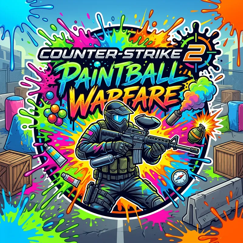 Create an image that merges the concept of Counter Strike 2, a popular first-person shooter video game, with the theme of paintball. The logo should incorporate elements of a first-person shooter such as guns or grenades, as well as the splashes of paint and bright colors traditionally associated with paintball. Don't include any specific or copyrighted character details.