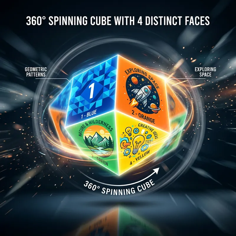 A cube featuring four different faces spinning 360 degrees