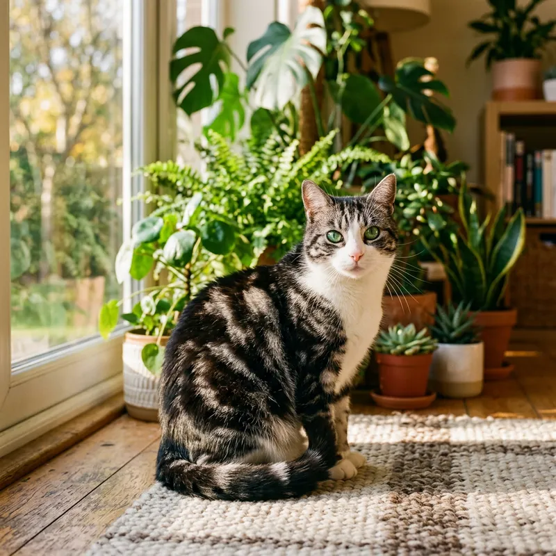 A cuddly domestic short-haired cat sits in the late afternoon sunlight. Its fur is a rich mix of black and white, giving the appearance of marble. The cat's emerald-green eyes shine with curiosity, reflecting its surroundings while it enjoys a moment of tranquility. Long whiskers protrude from its petite, pink nose. Its tail lies flat beside it, showing off its luxuriant thickness. Behind the cat, a backdrop of green houseplants adds a splash of natural charm. This common indoor scenario radiates a sense of peace and warmth.
