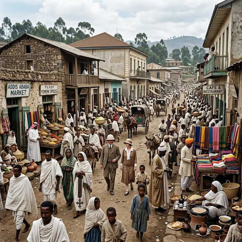An olden-day depiction of Addis Ababa, the capital city of Ethiopia. The city is bustling with activity illustrating its rich cultural diversity. Among the hustle and bustle, there are street vendors selling various goods, cultural artifacts, and cuisine representing multiple ethnic groups. Men and women of different descents - Middle-Eastern, Caucasian, Black, South Asian and others - are seen in traditional attire associated with their culture. The street architecture represents a blend of traditional and European styles common in early 20th century Addis Ababa.