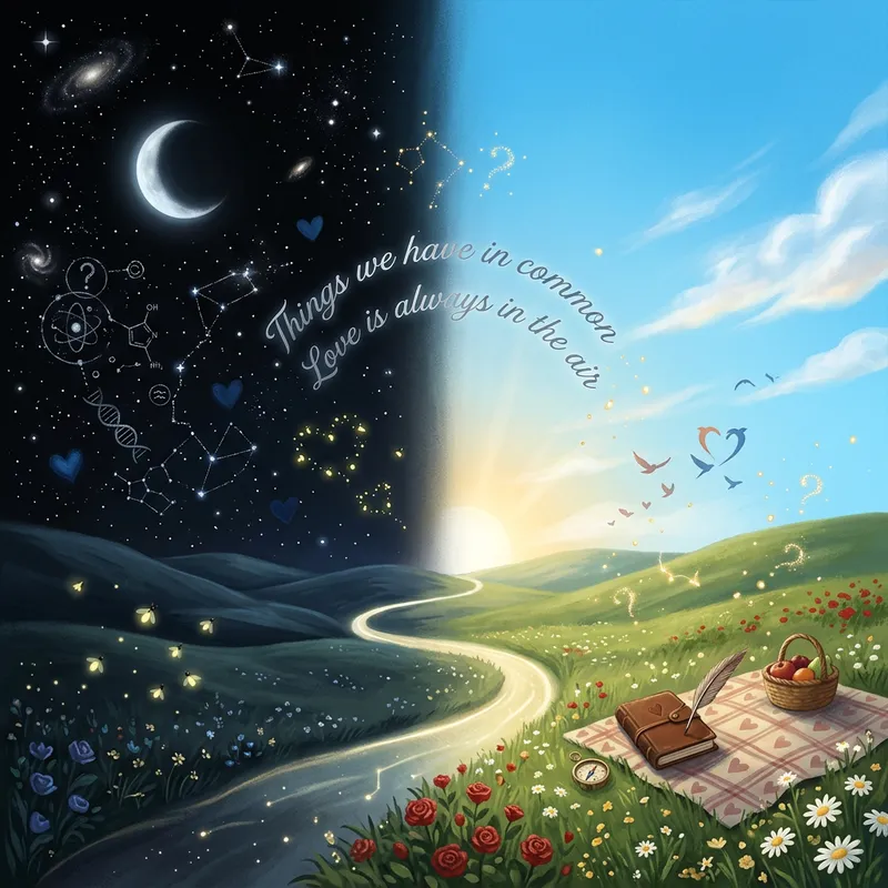 Create an image with a clear, azure sky, embodying an aura of curiosity. Next, illustrate one half of the scene dominated by the darkness of the night, in a rich, matte black hue. Through the image, subtly signify the question regarding the nature of things, manifesting as both common and rare elements intermingling. Lastly, incorporate symbols of love throughout the scene, representing an ever-present love in the air. Ensure the scene depicts a harmonious blend of these elements indicating things we have in common.