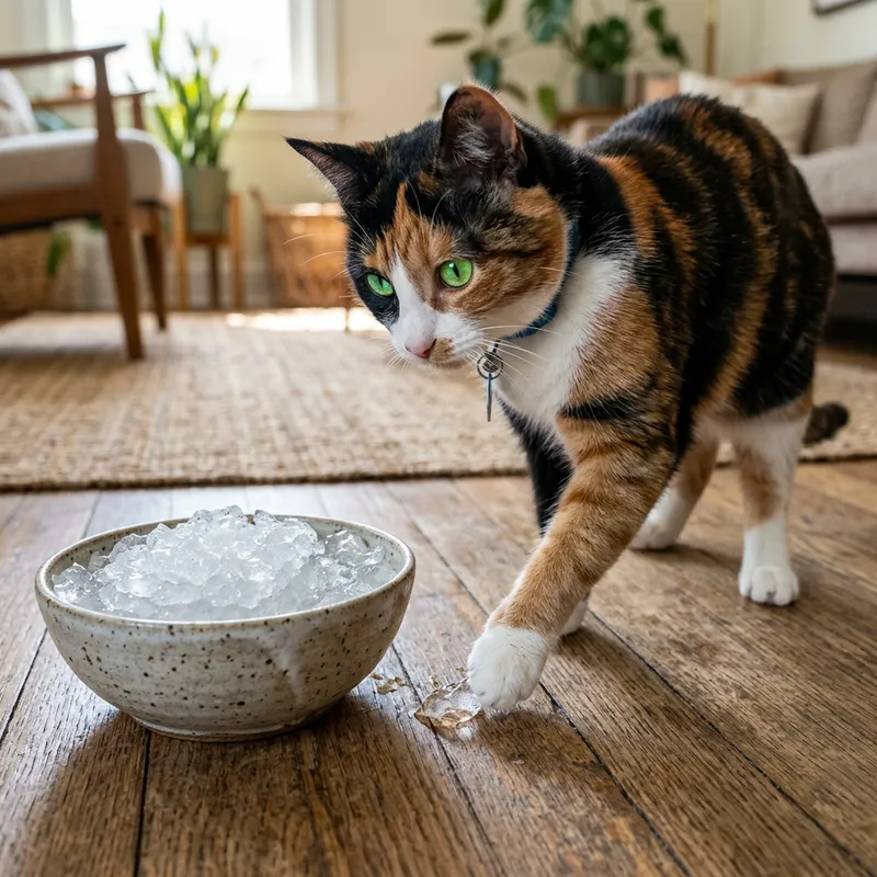 A cat of indeterminate breed, in a calico pattern of black, white, and red, standing next to a bowl filled with crushed ice. The ice shimmers with reflected light, suggesting that it is wet and cold. The feline looks curious, its green eyes glowing in contrast with its multicolored fur. It tilts its head slightly, as it paws at a stray piece of ice that has fallen from the bowl onto the wooden floor.