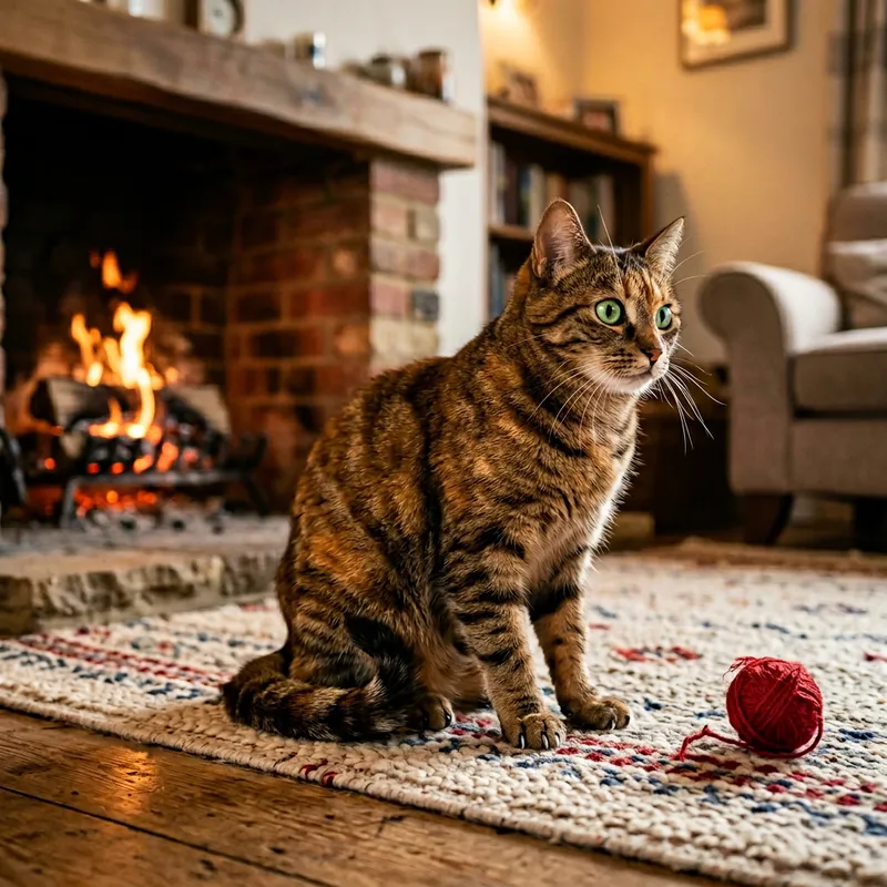 Create a lifelike image of a curious cat, sitting comfortably with its tail curled around its body. Its shiny fur gleams in the soft room light, and its piercing green eyes are wide open in fascination. It is attentively observing a red yarn ball just out of reach, it’s claws slightly extended. The excitement and the anticipation can be seen in its amped posture. Flickers of shadows dancing from the warm fireplace add a comforting tone to the scene.