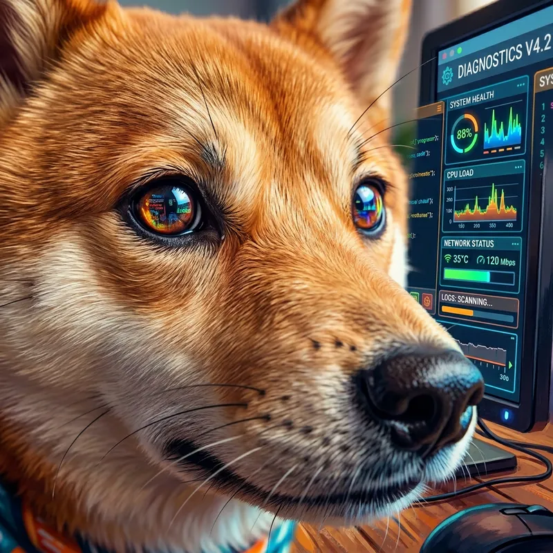 A curious Shiba Inu dog is entranced as it scrutinizes a computer screen displaying diagnostic software tools. The image, captured through the close-up perspective of a macro lens, makes visible the intricate elements of the scene. The visual narrative is rendered in brilliantly saturated colors and stark contrasts, infusing the scene with a sense of playfulness. The canine's expressions are depicted with a touch of whimsy that adds to the overall fun tone of the image. Executed in the style of a digital painting, the illustration features a combination of plush brushstrokes and sharp lines, evoking a technology-inspired aesthetic.