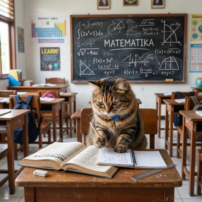 A fluffy tabby cat, engaged in a study session inside a classroom. The cat is sitting on a small wooden desk, with an open textbook labeled 'Mathematics' in front of it. It holds a tiny pencil in its paw, poised above a notebook. The room is filled with other student desks and a chalkboard at the front with complex equations written on it, representing a typical school environment. The chalkboard also has 'Matematika' (Mathematics in Indonesian) written on it, indicating a global educational setting. The expression on the cat's face is one of concentration and curiosity, as if it's solving a difficult problem.