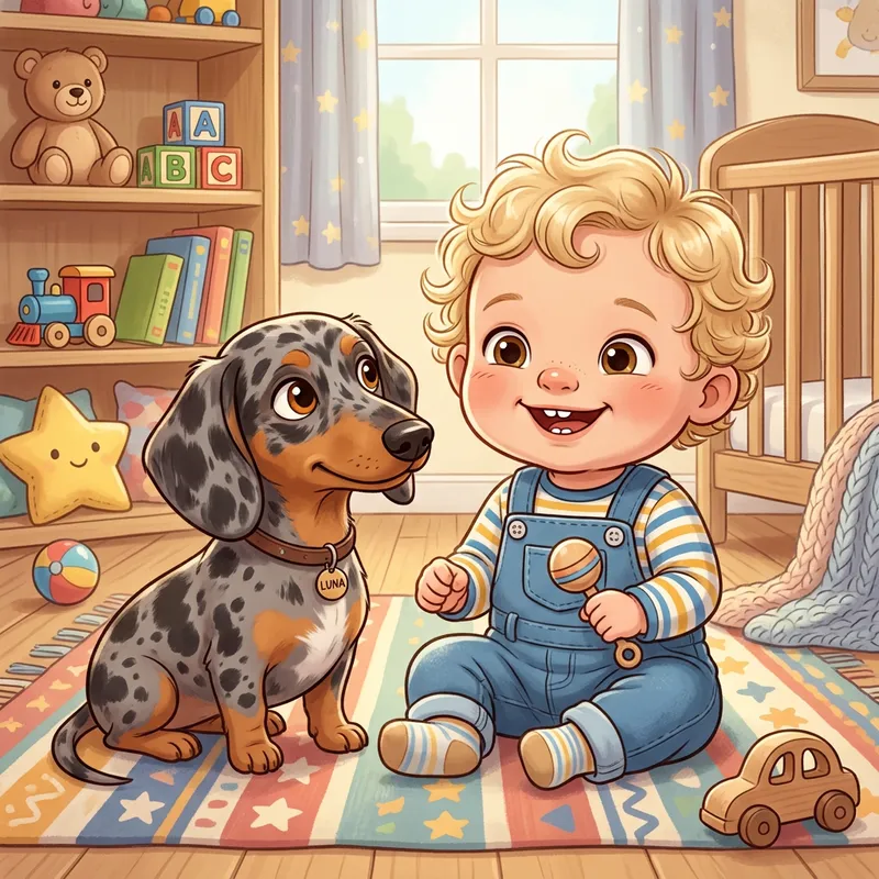 Curly Blonde-Haired Baby and Dachshund Dog Illustration