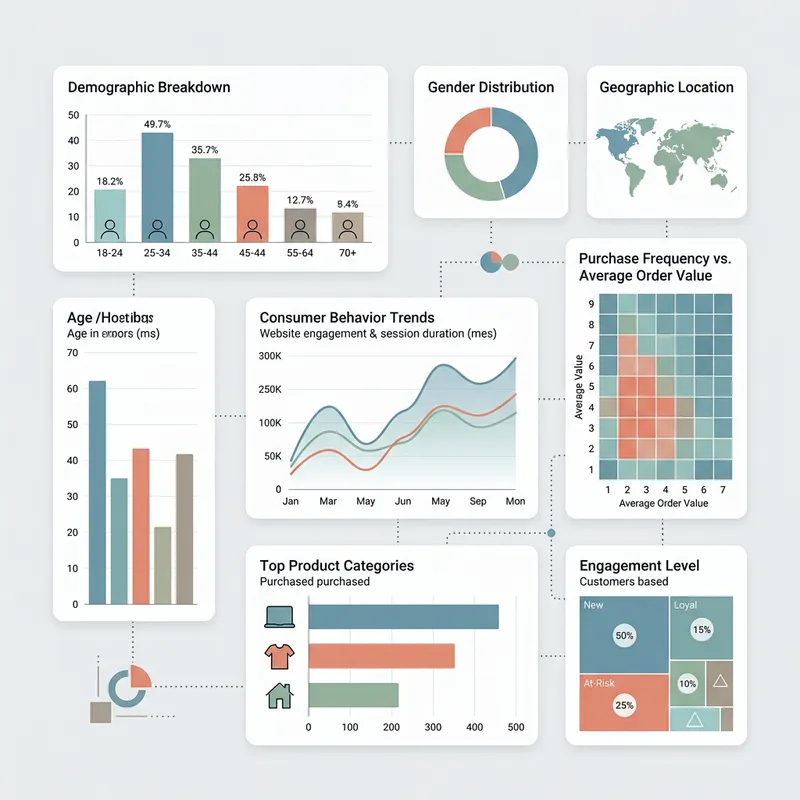 An abstract representation of customer data visualization in a modern and minimalist style. Displayed are different vector-based graphs and charts in subtle contemporary colors, laid out in a clean and streamlined fashion. The graphs represent diversified categories such as demographic information, consumer behaviors, purchasing patterns, and more. The style of visualization emphasizes simplicity, order, and functionality while staying aesthetically pleasing. Each piece of information stands alone, but when viewed together, they form a coherent and insightful visual story of customer data.