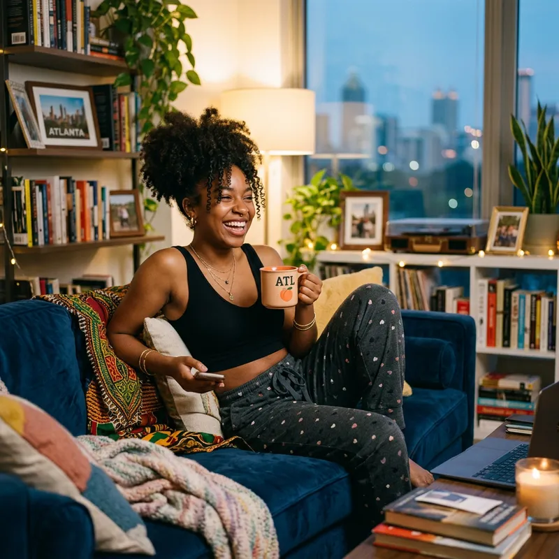 Cute 19yo ebony girl, Atlanta native, chilling at home, pyjamas, crop top.