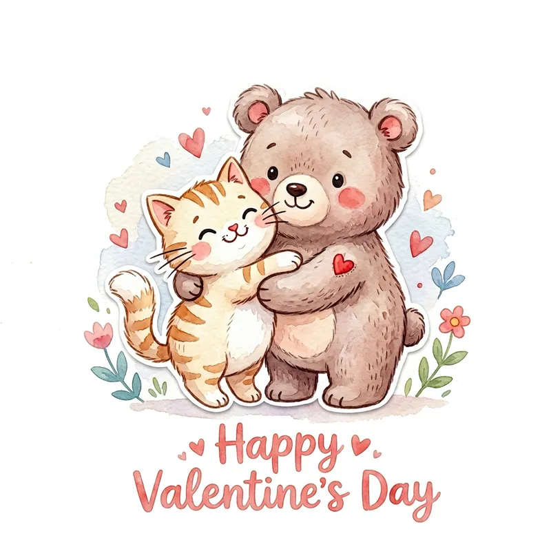 Cute and adorable little bear hugging a cat, designed in the style of watercolor clipart with the phrase 'Happy Valentine's Day' below it. Perfect for a Valentine's card, featuring playful expressions and soft pastel colors in a charming, cut-and-paste aesthetic. The image is centered with a clear white background and ample margins and all elements of the scene are fully visible.
