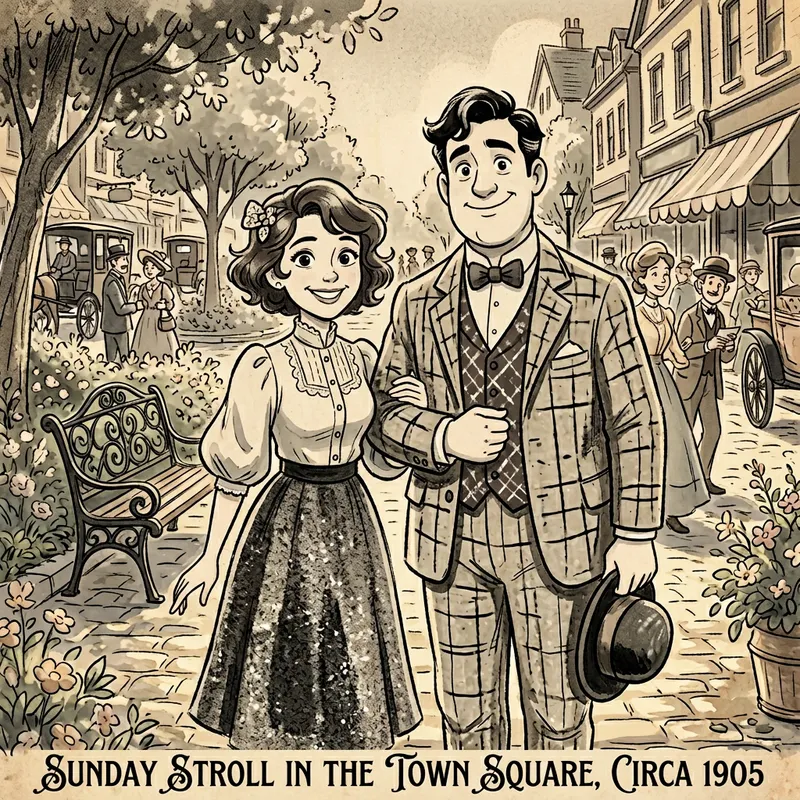 An animated depiction of a short brunette woman and a tall, slightly plump, clean-shaven man with black hair, both looking into the camera with friendly smiles. Their looks should be similar to the animation style used pre-1912 in order to avoid the modern style, such as Pixar. The woman and man should be depicted as cute and pleasing characters in outfits appropriate for their form. The color palette should be vibrant and scene filled with warmth and joy.