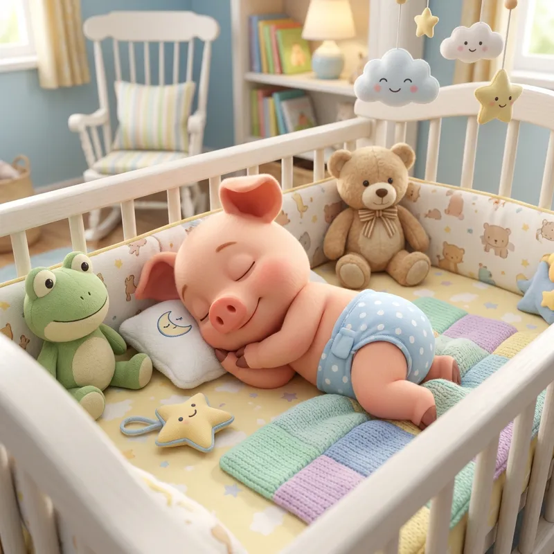 Sweet Baby Piglet Cartoon in a Joyful Crib