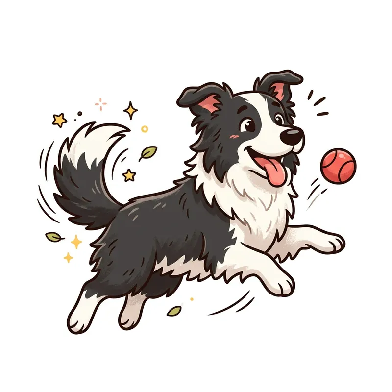 A cute Border Collie playing and frolicking in a cartoon style, on a white background