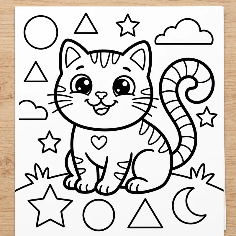 A picture of a cute cartoonish cat designed for children aged 3 to 4 years to color. The cat has endearing, prominent eyes and a wide, friendly smile, with its tail curving playfully. All the lines are thick and clearly defined, perfect for young children honing their coloring skills. It sits on a simple background featuring basic shapes like circles and triangles to provide additional coloring opportunities. Remember, the entire design should be simplistic and inviting to kids of the specified age range.