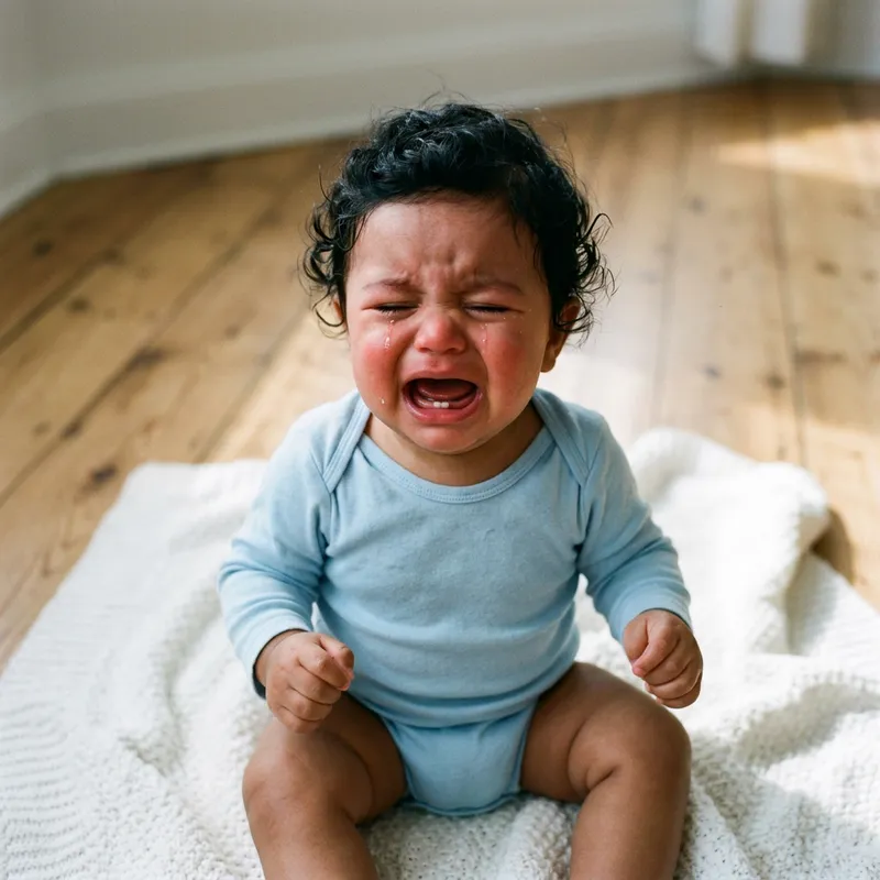 A small baby with olive skin and curly black hair, dressed in a soft pastel blue onesie, crying. The baby's eyes are shut tightly as tears stream down its rosy cheeks. The baby's mouth is wide open in a cry, revealing tiny white teeth. The baby is seated on a fluffy white baby blanket on a wooden floor.