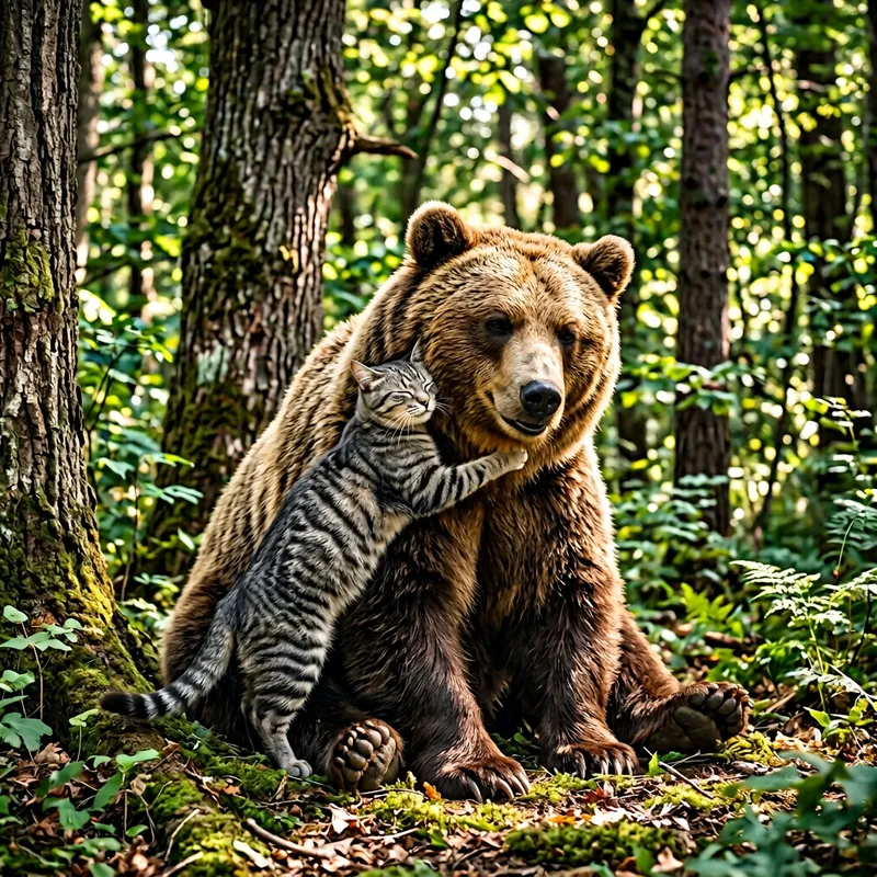 A cute domestic feline, with stripes of the grey spectrum, is hugging a big, grizzly bear, which has brown fur. Their expressions are content and peace can be observed in the scene. The bear is sitting while the cat, significantly smaller than the bear, has jumped onto its torso and wrapped its arms around the bear's neck. The setting is an area in the woods with the age-old trees around, the sunlight breaking through the branches casting dappled shadows on the pair displaying unusual camaraderie.