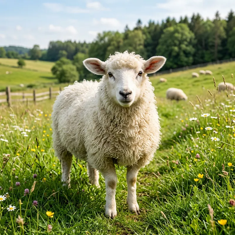 A cute and fluffy white full-grown sheep standing on a lovely green meadow during the daytime. This sheep has long, curly, and soft white wool that covers its entire body. Its black eyes are full of innocence, and it has large ears that appear to listen attentively to every sound in the environment. The scene is peaceful, encapsulating the serene co-existence of wildlife and nature.