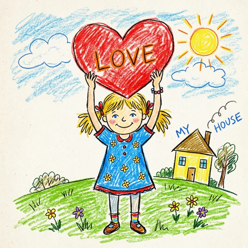 A picture of a girl of Caucasian descent, holding up a heart with both arms. The image should evoke the look of a crayon-drawn picture.
