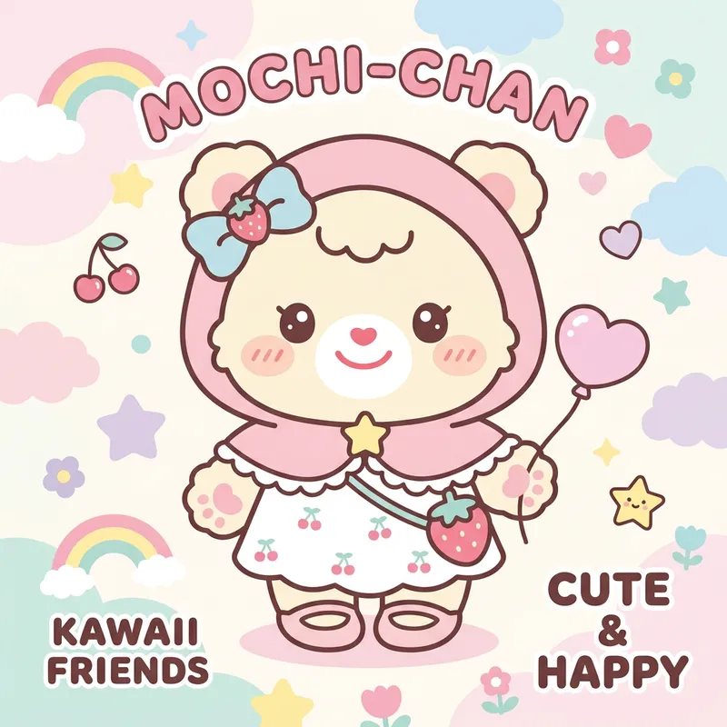 Cute Hello Kitty-style kawaii character design with simple rounded features, adorable Japanese Sanrio aesthetic with pastel colors and cheerful expression, charming minimalist character art perfect for merchandise and fan creations