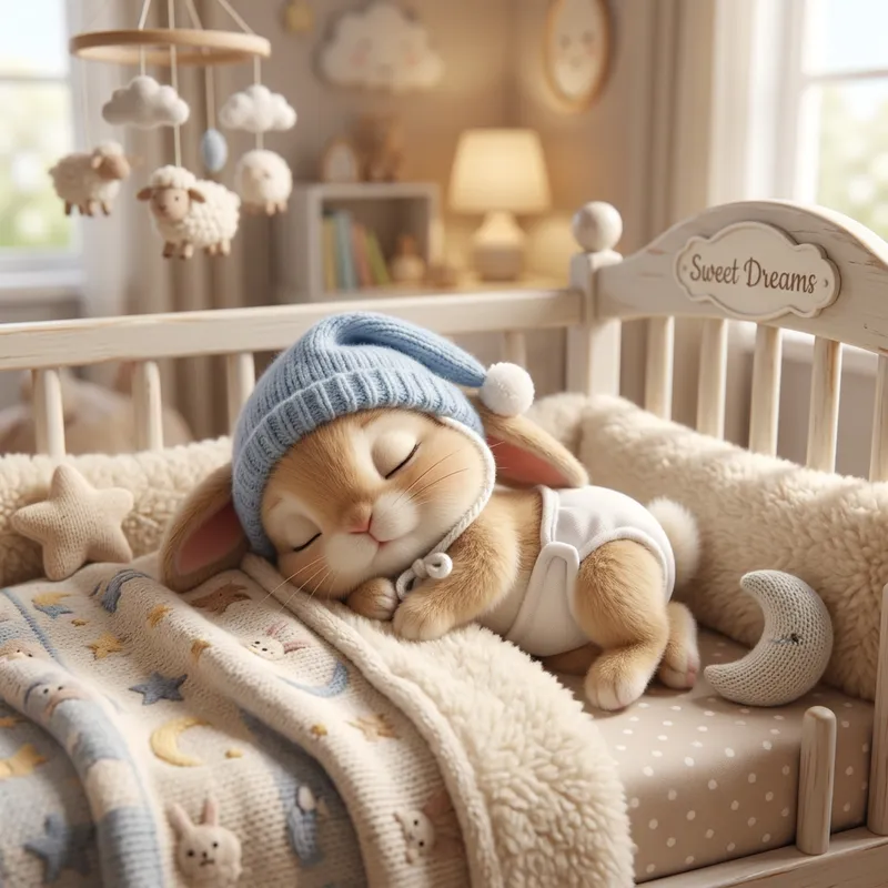 Create an image of a cute animated baby bunny, just one month old. It's fast asleep in its crib, wearing a baby's diaper and a little baby cap.