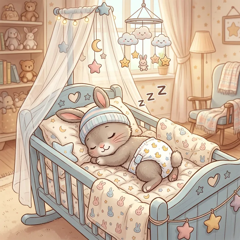 Illustrate an adorable, animated cartoon of a one-month-old baby rabbit wearing diapers and sleeping comfortably in a cradle. The newborn bunny is also wearing a cute baby hat.