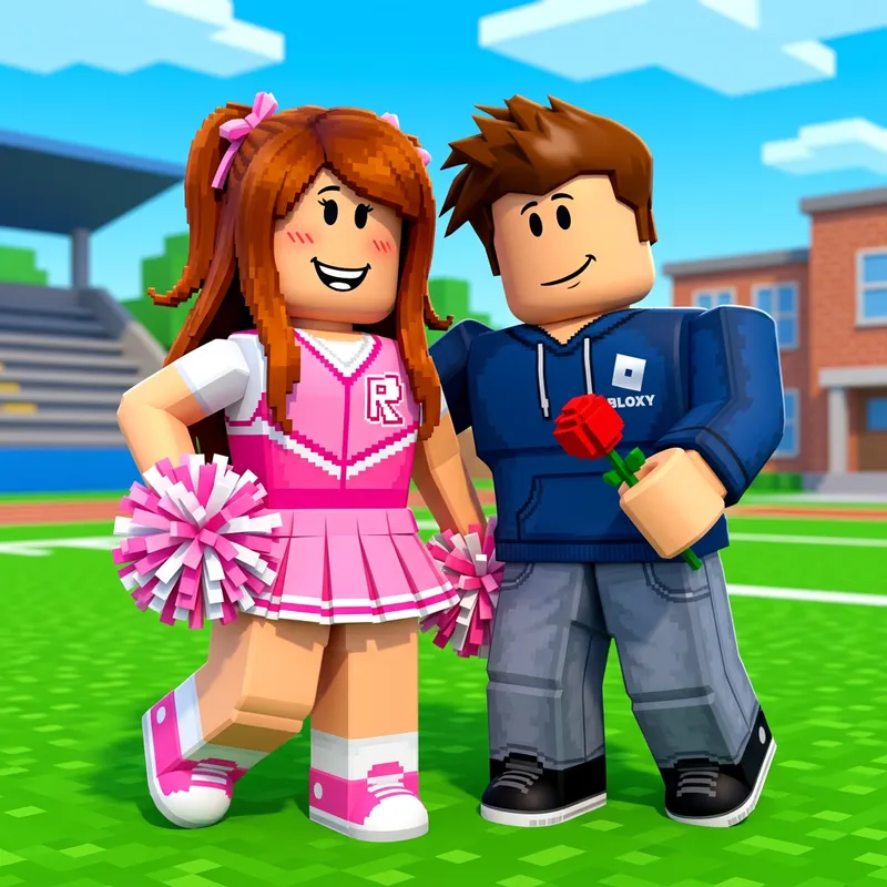 An adorable Roblox-style girl with vibrant brown, long hair, dressed as a cheerleader. Next to her is her friendly Roblox-style boyfriend. They are both presenting in an endearing, charming pose, suggesting their amusing digital relationship.