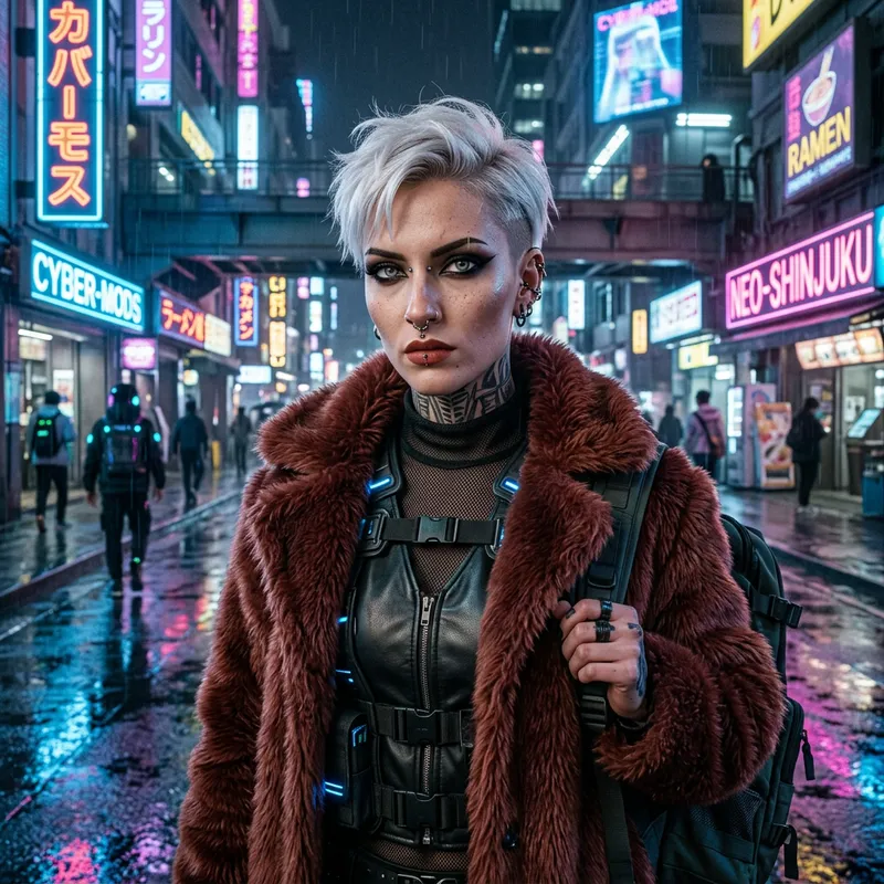Create a photorealistic image of a confident and assured female character with striking white hair and piercing gray eyes, lined with black eyeliner. She sports facial piercings and has a distinctive large nose. Her attire includes a brownish-red colored fur coat. Set this character within the genre of cyberpunk, highlighting the high-definition digital art style.