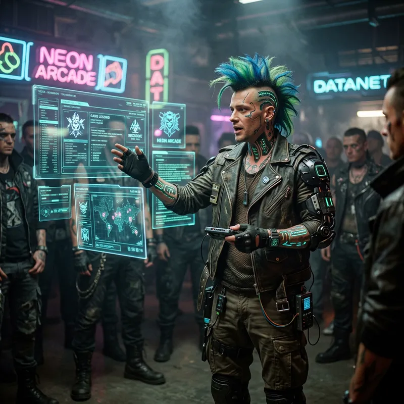 Cyberpunk Gang Member's Presentation on Hovering Screens