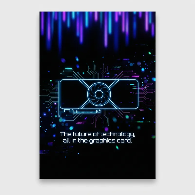 Picture a web poster immersed in the aesthetic of the cyberpunk genre, where the background is jet-black, adorned with several streaks of neon lights on the top. At the center of this poster, a video card is captured, marked by just a few crisscrossing lines that hint at its shape. Intricate circuit lines and an array of luminescent effects sprinkle the scene, exuding a sense of futuristic technology. Adjacent to the graphics card is a straightforward line of text that reads, 'The future of technology, all in the graphics card.'