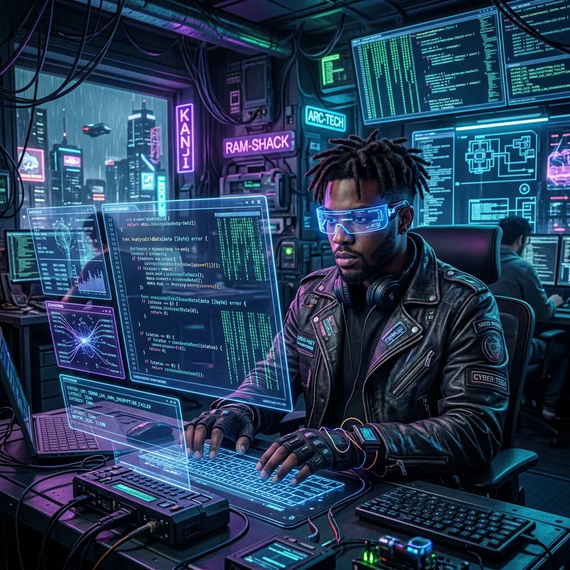 A detailed scene in a cyberpunk style, featuring an African-American male software developer writing code on a holographic interface that appears suspended in thin air around him. The environment around him is a high-tech office with neon lights and massive screens displaying lines of code. He's wearing a typical cyberpunk attire: black leather jacket with lots of zippers, neon-light glasses, and fingerless gloves. Monitors around him show complex algorithms, glowing neon lines, and futuristic matrix-style codes.