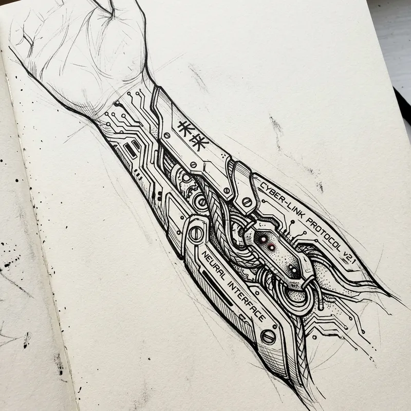 Create a sketch in black and white on a pristine sheet of textured paper, depicting a detailed design for a cyberpunk-style tattoo. The tattoo design should illustrate an imaginative concept of a cybernetic implant, focusing specifically on a human forearm. The drawing should show intricate circuitry patterns and sleek mechanical details representing cutting-edge technology, blending with elements of natural human anatomy. The style should evoke a sense of futurism and rebellion consistent with the cyberpunk genre.