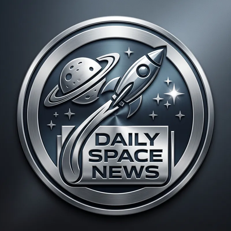 Create an icon that represents daily space news. The design should be simple, with a metallic finish. The icon may include elements associated with outer space, such as planets, stars, or rockets, combined with elements that represent news, such as a newspaper or a microphone. The overall aesthetic should be sleek, futuristic, and professional, and the color scheme should reflect the metallic element of the description.
