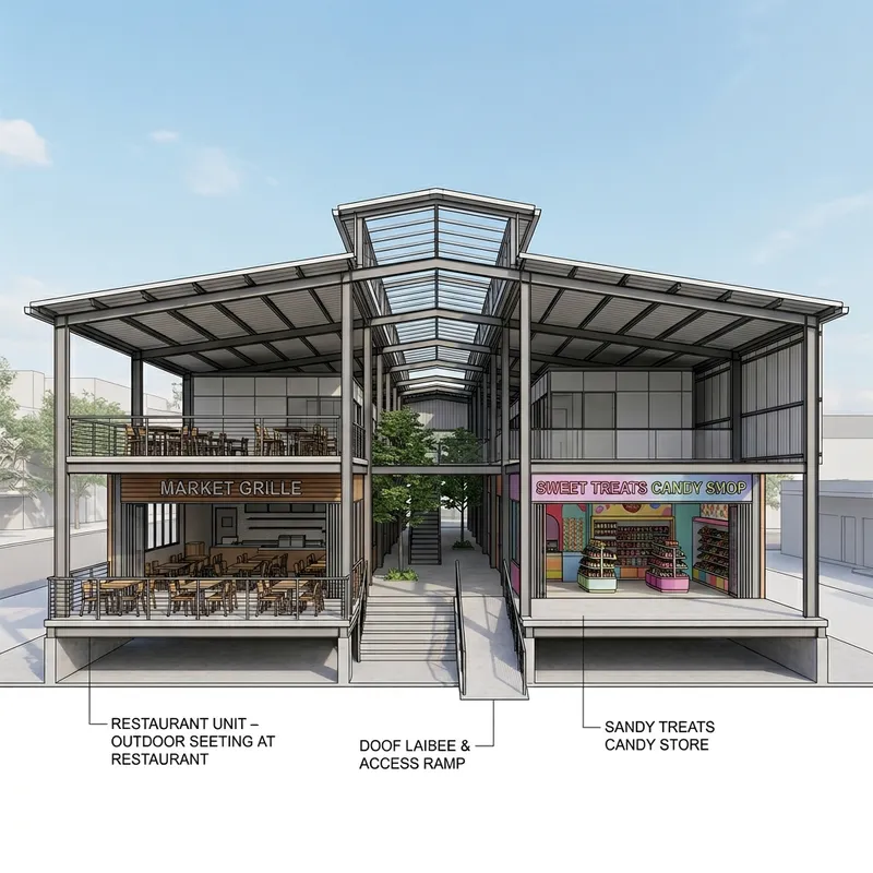 Show me the facade of a small market (steel columns, concrete floor and a thermal panel roof with a ridge above the roof where light enters) a bit elevated with two levels that can be accessed by a staircase and a ramp leading to a central aisle (this is in the middle of the building and the ramp and stairs are on the facade of the building). On the left side of this aisle, at the beginning of the market, there is a restaurant (which has a rooftop) (only the restaurant part has a rooftop) and on the right side, a candy store. (this is seen in a render-style elevation)