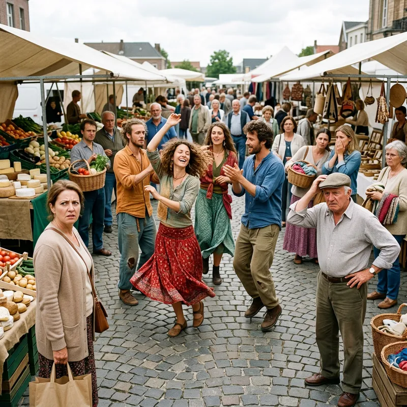 An image depicting a group of individuals dancing passionately in the middle of a marketplace while onlookers, who are unable to hear the music, regard them with expressions of perplexity and confusion.