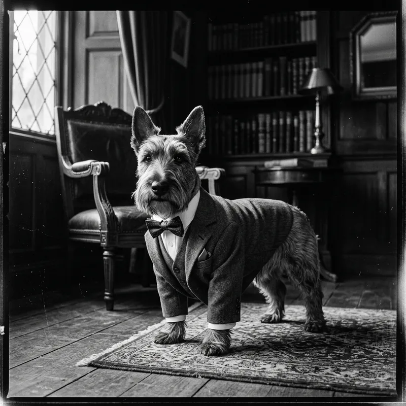 A stylish dog dressed in a fitted suit, presented in black and white photography. The image is characterized by pronounced lighting and shadows that adds a layer of drama and sophistication. The canine subject exudes confidence, poising elegantly within the frame. The overall aesthetics and feel of the image are largely influenced by the stylistic approach of a vintage film camera, drawing parallels with the trend of 1920s fashion photography.
