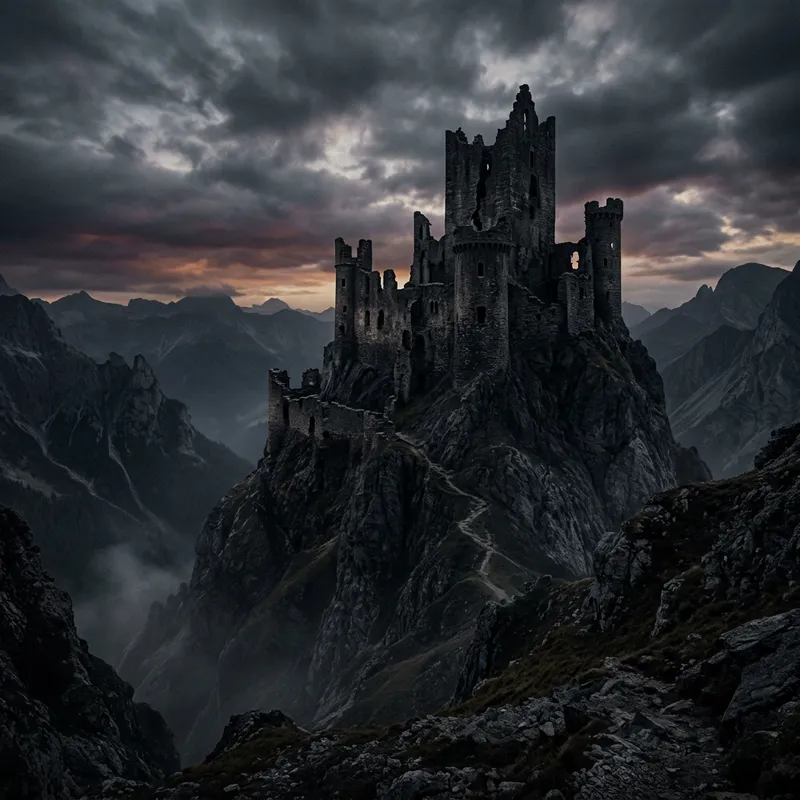 dark castle derelict on mountain