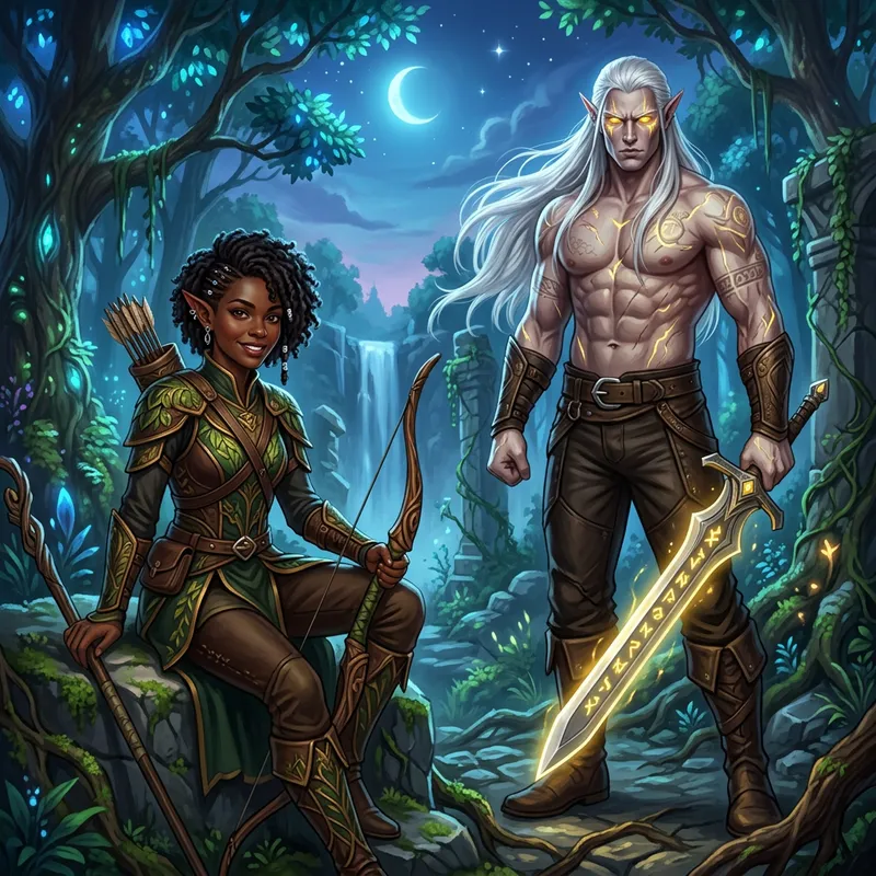 A depiction of two distinct elf characters. The first is a Black woman, an elf with short hair, while the second is a pale, tall elf man with long white hair. The man's yellow eyes glow intensely and he displays a muscular physique, with no shirt on.